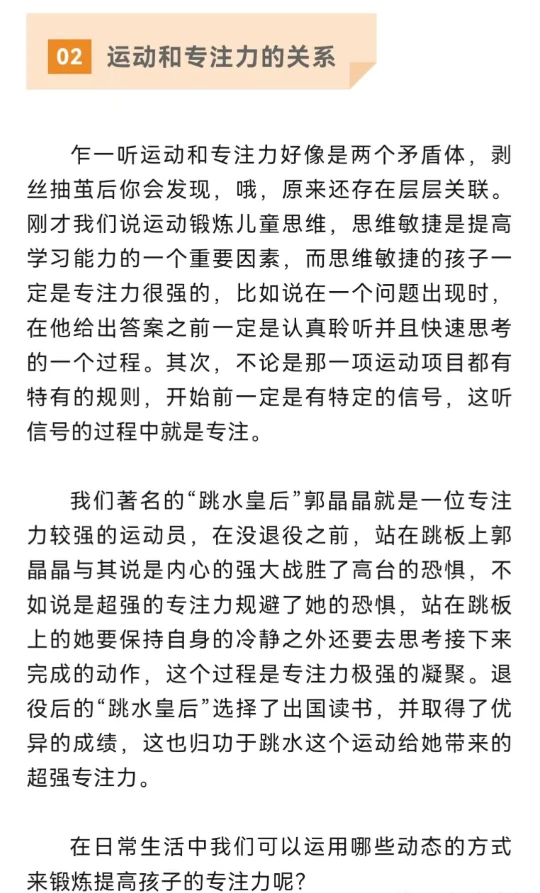 以動(dòng)制靜策略 制定規(guī)則、明確目標(biāo) 不論是在家中還是在課堂都可以利用兒童發(fā)展天性,學(xué)會用游戲來提高專注力,前提一定要制定可執(zhí)行規(guī)則。比如說聽到書,就要找到與書相關(guān)的物體但是不可以拿書;聽到籃球,就要找到與籃球同類的物體但是不可以拿籃球...增強(qiáng)傾聽專注力和思維靈敏。 提高自控、增強(qiáng)執(zhí)行 執(zhí)行力需要自控,而自控需要專注力,抑制內(nèi)心的沖動(dòng),學(xué)會冷靜思考。在日常生活中我們可以這樣做,明確分配每一位家庭成員的家務(wù)任務(wù),需要在規(guī)定時(shí)間內(nèi)完成,并且由所有家庭成員認(rèn)可通過后才可以獲得觀看漫畫書或者動(dòng)畫片的權(quán)利。長期養(yǎng)成習(xí)慣提高執(zhí)行力,且通過規(guī)則等待提高自控力。 多變引導(dǎo)、刺激興趣 為什么孩子看動(dòng)畫片、玩游戲可以紋絲不動(dòng),可是一寫起作業(yè)就東張西望;玩樂高能玩1小時(shí),看書堅(jiān)持不了10分鐘?孩子的專注力不夠還有另外一個(gè)因素就是興趣,如果孩子對看書不感興趣,再怎么逼都沒有,不光是孩子,成人也是一樣。那我們在日常生活和課堂中可以經(jīng)常變化玩法,比如減少看電視時(shí)間可以一起出去拿快遞;上課坐不住了可以穿插不同小游戲,還可以通過聲音變化、服飾變化引起孩子關(guān)注······最終的目的要將孩子的無意注意轉(zhuǎn)化為有意注意。多變化式引導(dǎo),尋找孩子的興趣點(diǎn)。 但心理學(xué)上,專注力的關(guān)聯(lián)還有很多方面,如注意力和認(rèn)知能力有關(guān),和視覺搜索有關(guān),和情緒有關(guān)等等。我們需要多理解和接納孩子。生活因動(dòng)而有趣,因多變而精彩,注意動(dòng)靜結(jié)合,也要學(xué)會以動(dòng)制靜,不要一昧的壓制打造一個(gè)“坐如泰山”的孩子。